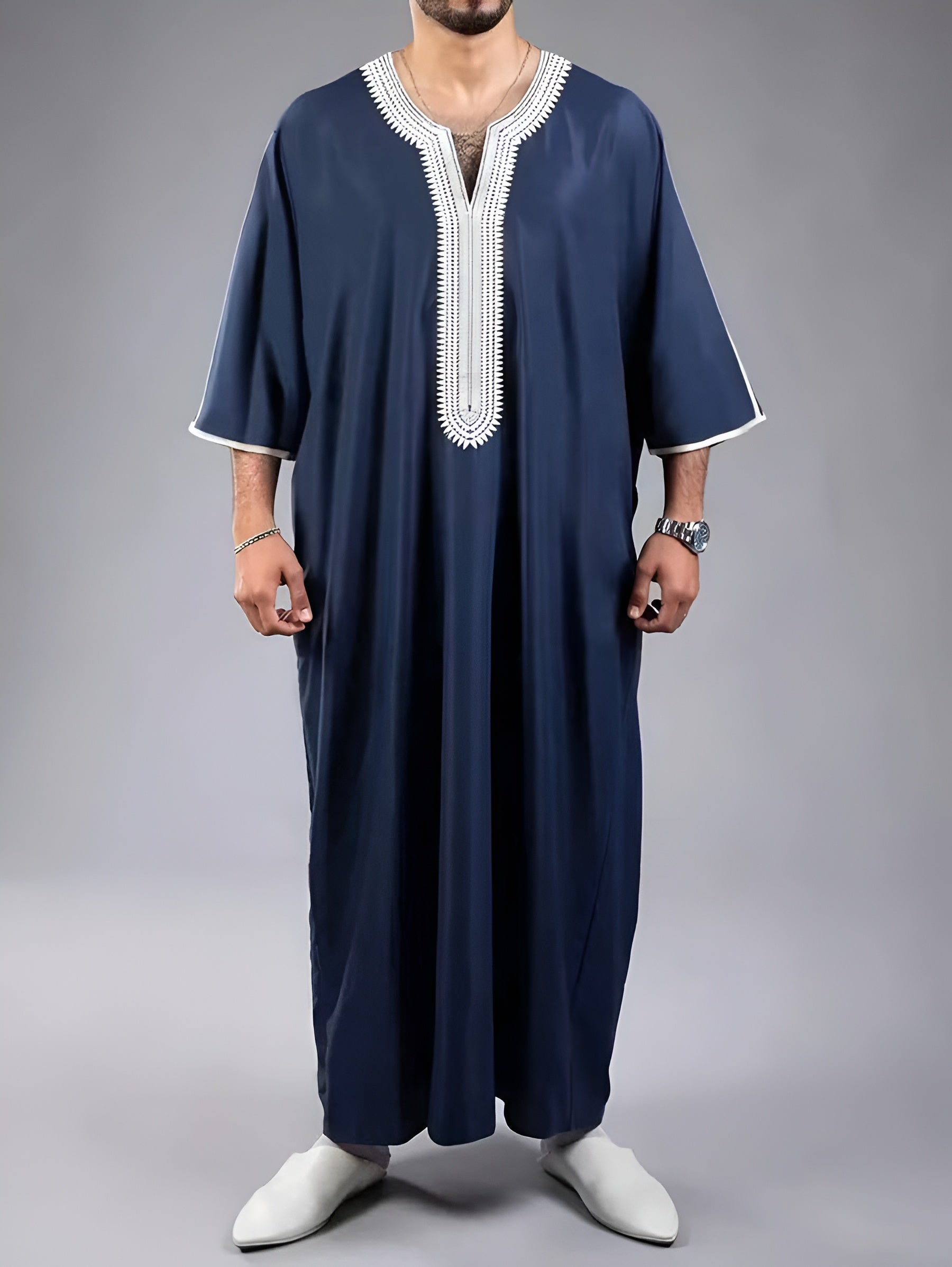 More than just clothing, this Navy and White Oversize Thobe represents a dedication to quality and cultural heritage. Designed for the discerning wearer, it effortlessly bridges the gap between tradition and modernity. Care for it gently to maintain its pristine look and enjoy a garment that will be a cherished part of your wardrobe for years to come.